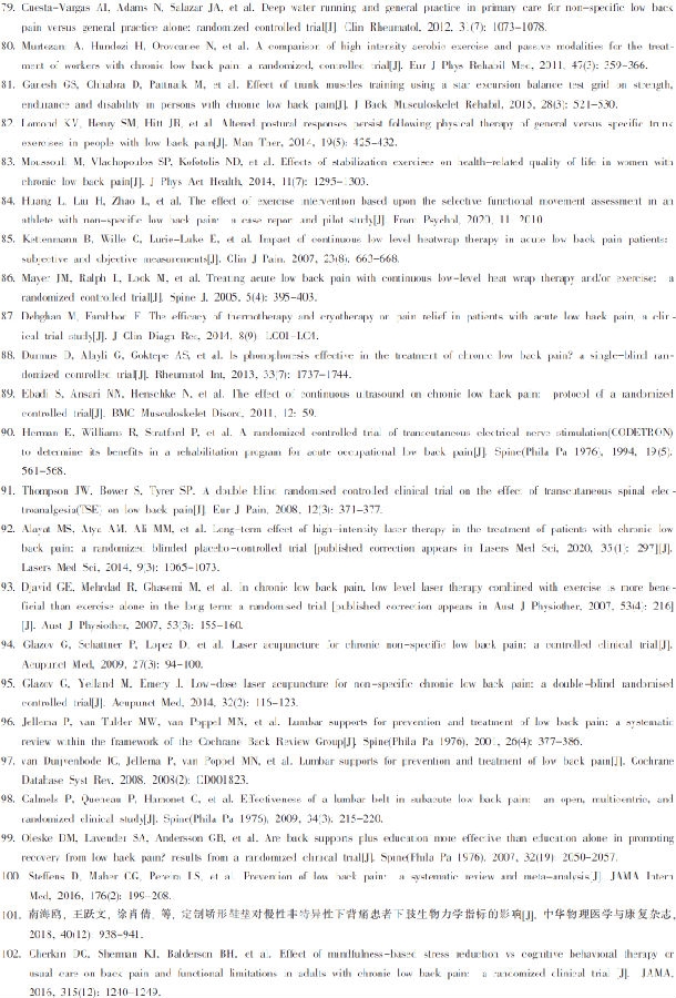 物理因子可以用于NSLBP的辅助治疗,主要包括经典的温热疗法和冷疗等物理因子治疗,可通过改善局部肌肉痉挛和血液循环在短期内缓解疼痛、改善腰背部功能(2级推荐)[85~87],主要治疗措施如超声波治疗[88、89]、经皮神经电刺激[90、91]、激光治疗[92~95]等(3级推荐)。