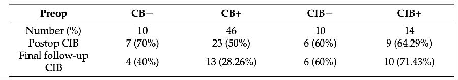 (2)术前CIB患者术后即刻的平衡代表了最佳状态,缺乏进一步恢复平衡的代偿能力,其中CIB+类型的患者代偿能力最差。
