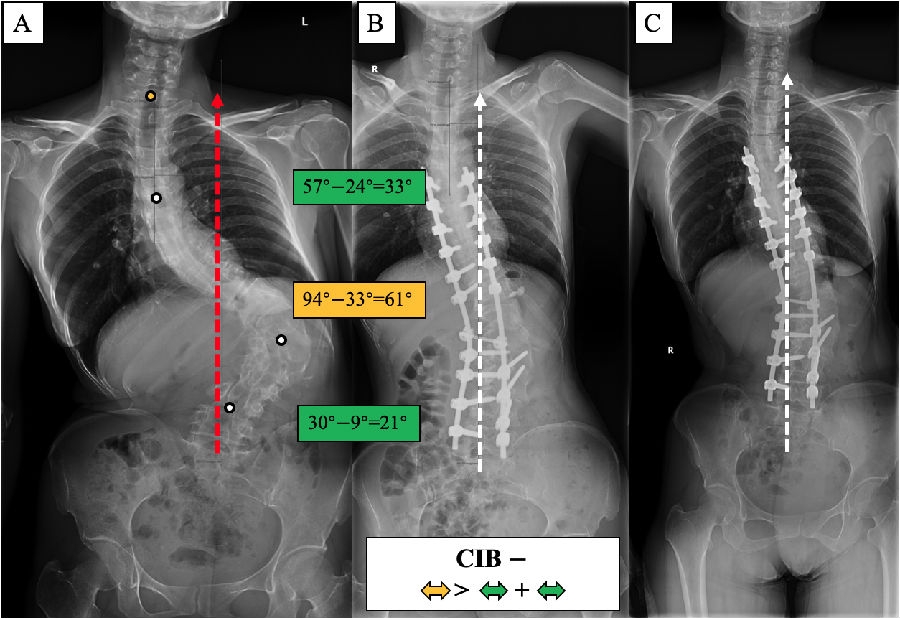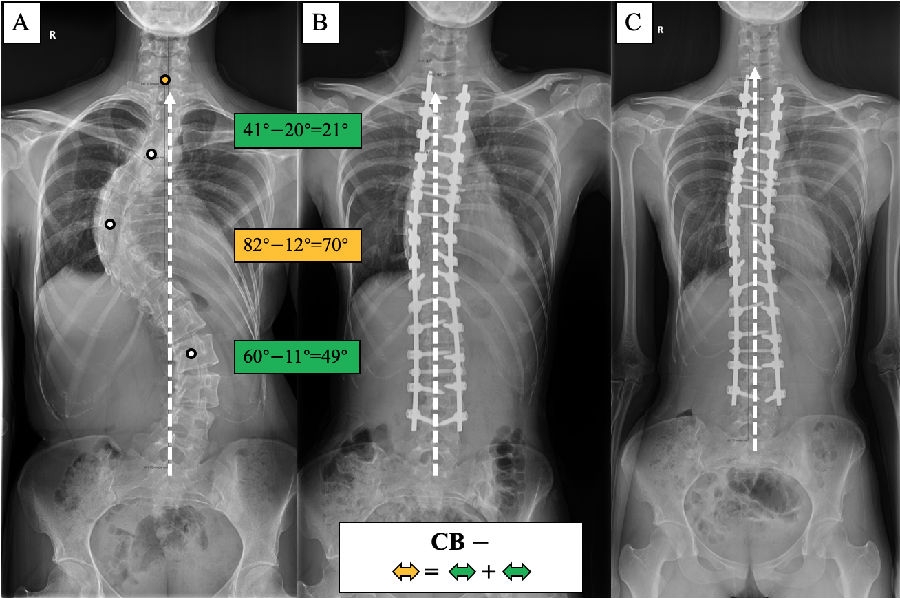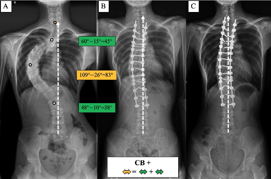 (2)术前CB-患者,重点矫正主弯,主弯矫正幅度>代偿弯矫正幅度之和。