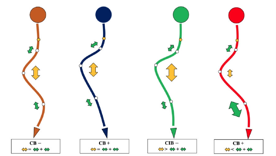 基于以上临床观察,我们提出了脊柱侧凸顶椎位置分布的冠状面平衡修正[7]。首先,根据CBD是否大于2cm,将患者分为冠状面平衡(coronal balanced, CB)和冠状面失平衡(coronal imbalanced, CIB)。然后,根据患者各个弯曲顶椎/椎间隙中心的分布特点,赋予顶椎位置分布修正(-/+),若果各顶椎中心分布在CSVL两侧,则为修正(-),若各顶椎中心分布在CSVL同侧,则为修正(+)(图7)。