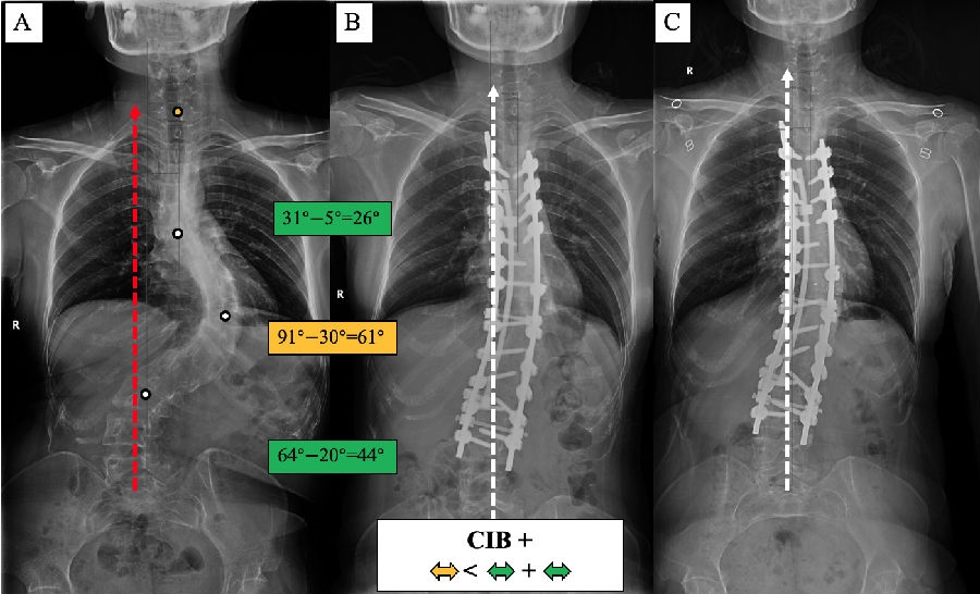 (3) 术前CIB-患者:主弯矫正61°,上胸弯及腰弯矫正分别为33°和21°,术后平衡改善。