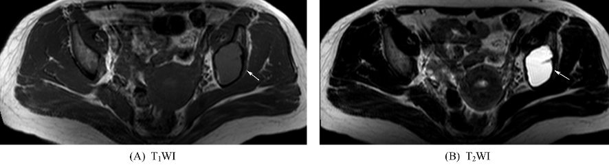图10 骨囊肿左侧髂骨内见类圆形长T1、长T2信号影,边界清晰,见低信号硬化缘。