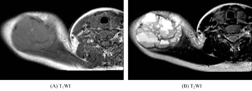 骨纤维异常增生症可发生于单骨、单肢、单侧或多骨多发。单骨型多见,好发于四肢骨;躯干骨以多骨型常见。发生于四肢管状骨者病变多始于干骺端或骨干并逐渐扩展,较少累及骨骺。发生于颅骨者常多骨受累。病变形态多样,T1WI上多为低信号,T2WI依含骨小梁、细胞、胶原、囊变及出血等成分的不同,可以是高信号也可以是低信号(图9)。可并发骨骼畸形和病理性骨折。