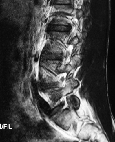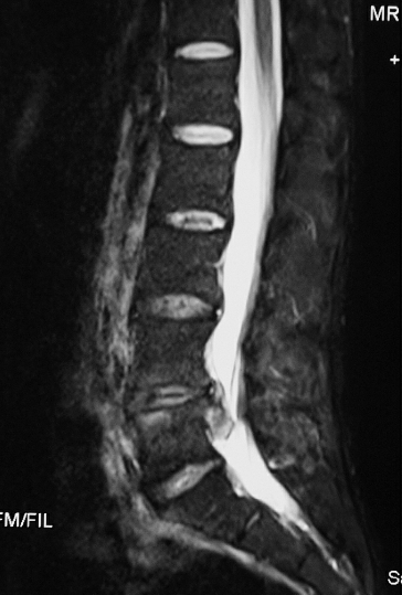 图2 MRI L4~5节段矢状位片:椎间盘脱垂到Ⅲ层面