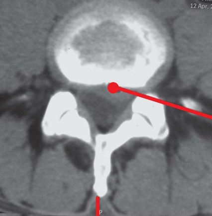 1.对于脱垂型腰椎间盘突出症这类型的病例,在穿刺点的设计时要更向头端。应用TESSYS技术-3靶点法中的穿刺点定位,以脱垂髓核基底部(L5椎体的后上缘)为靶点,穿刺方向线和穿刺角度线的交点来定。