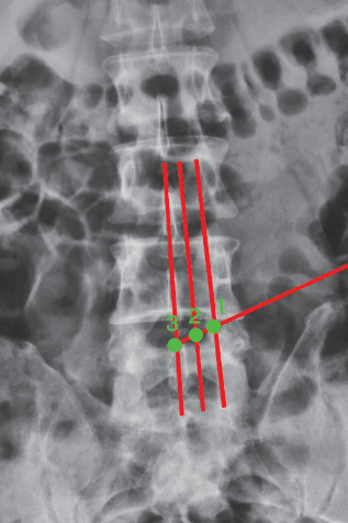 图5 腰椎DR前后位片穿刺方向线1.第一靶点;2.第二靶点;3.第三靶点