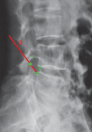 图6 腰椎DR侧位片1.上关节突尖;2.L5椎体后上缘;3.穿刺角度线:上关节突尖与椎体后上缘的连线。