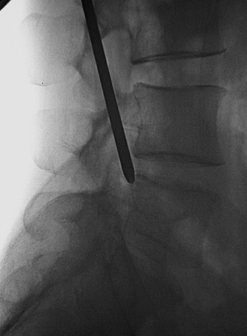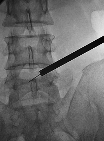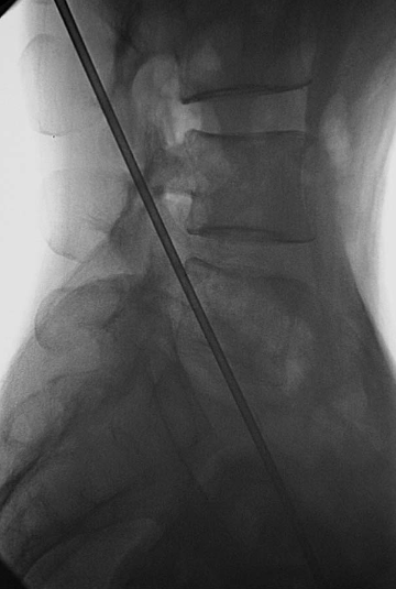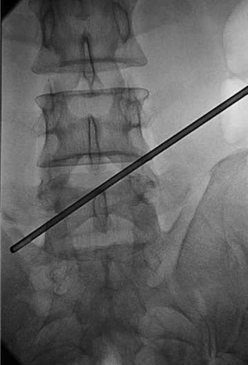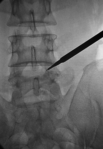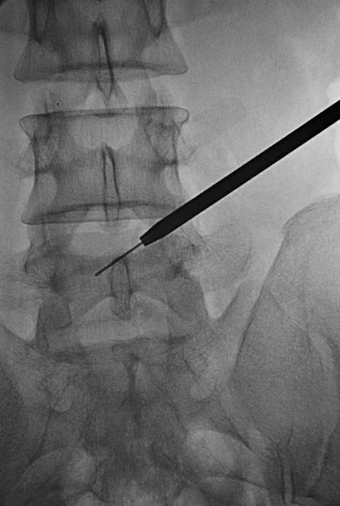 达第一靶点勺状针沿笔尖针推进5~10mm抵达纤维环外(达第一靶点),退出笔尖针在勺状针里注射盐酸芬太尼50μg(用0.9%氯化钠3ml稀释),注入毕,置入导丝,并超出勺状针10mm。