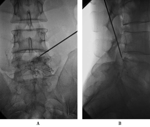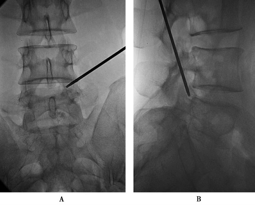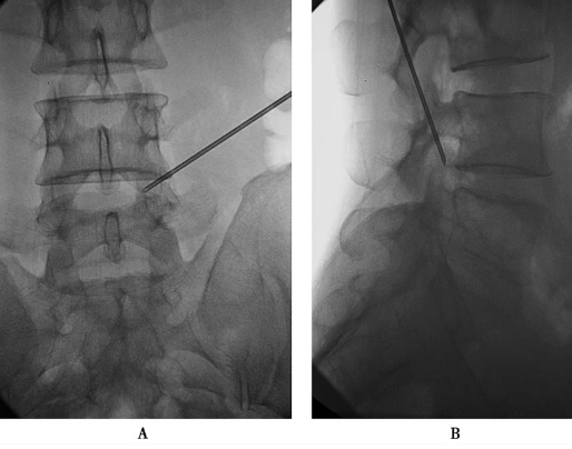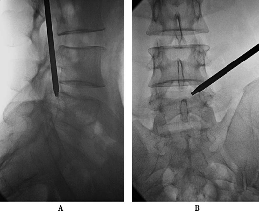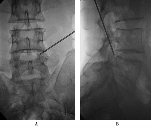 图13 双针技术A.前后位透视笔尖针针尖达第三靶点;B.侧位透视笔尖针针尖达L5椎体后缘(突出髓核内)。