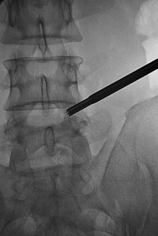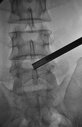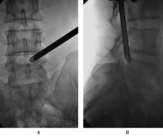 图24 置入工作套管A.前后位透视斜口工作套管的短边位于椎弓根内侧缘;B.侧位透视工作套管头端位于L5椎体后缘