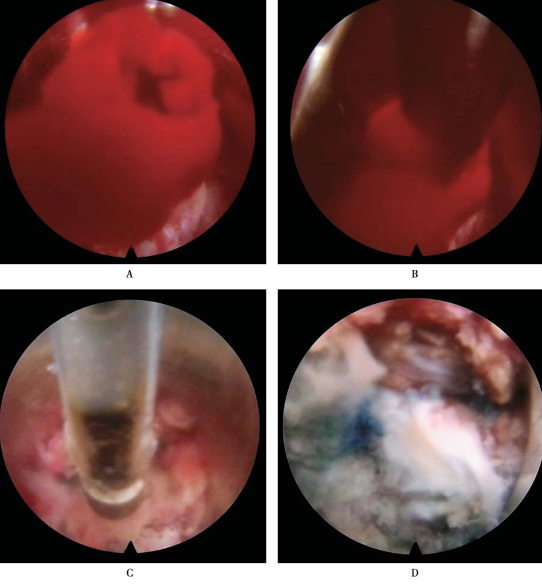 图25 清理工作区椎间孔镜置入A.看到血凝块;B.小抓钳抓取;C.射频头止血、消融、探查;D.分离出工作区