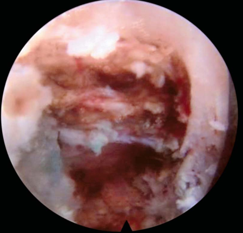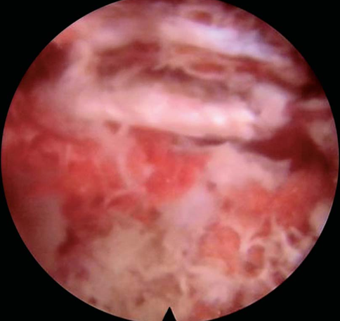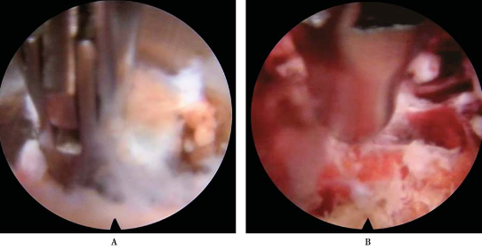 清理工作区:脊柱内镜置入,看到凝血块,小抓钳抓取,射频头止血、消融、探查,分离出工作区(图25)。