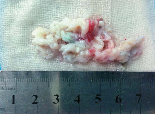 造影与染色(图14):注入突出物内2ml碘海醇和亚甲蓝的混合液(4∶1)进行造影与染色。