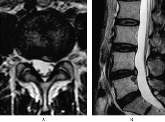 图31 术后1周复查MRI L4/5A.轴位;B.矢状位