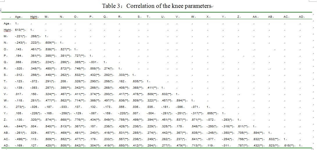 部分参数间的相关性分析见表2、3。股骨头高度与股骨距、颈干角有很强的相关性,颈干角大者,自然其股骨头高度要大,另外测量过程中发现,男性的颈干角要大于女性,加上身高的因素,股骨距也要大。股骨髁前后径、股骨髁长度与胫骨平台左右径、内外侧平台前后、左右径均呈强相关性,任何个体的股骨远端和胫骨近端都是匹配的,故测量的股骨远端与胫骨近端数据呈明显的相关性。