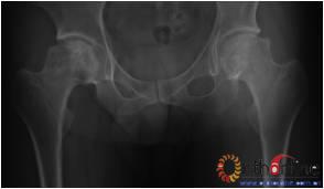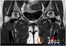 图3-1 女,31岁,SARS患者骨坏死,(1)MRI示双侧股骨头坏死,右Ⅱb(B型),左Ⅱc(C1型);(2)打压植骨术(未加BMP2)后坏死修复不完全,仍遗留股骨头软骨下病灶未完全修复, 5年随访关节功能优(Harris评分96分)