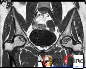 1.2 分期与分型 所有患者术前均行双髋MRI扫描(GE Sigma profile 1.5T T1WI和T2WI,部分患者尚加用T2WI压脂及STIR序列),双髋正位和蛙式位X线片,大多数患者也行双髋CT扫描,冠状位、轴位及矢状位二维重建。