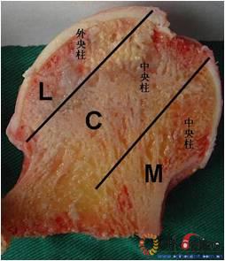 图1 股骨头冠状面三柱结构:外侧柱占30%,中央柱占40%,内侧柱占30%