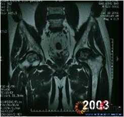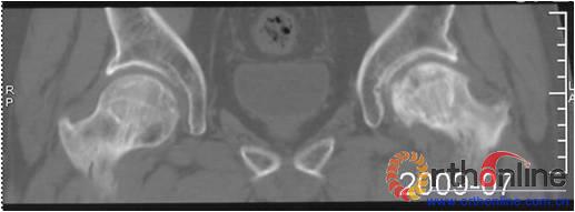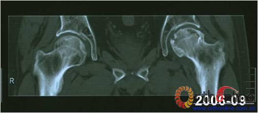 Fig 3 Male, 53 year-old, steroid-associated ONFH, MRI(2003) showed type L1 necrosis(cortical bone was preserved, necrosis in bone marrow) in right side; type L3 necrosis(both cortical bone marrow) in left side. CT scan showed the right femoral head keep round, and collapse occurred in left femoral head three (2006) and six year (2009) later.