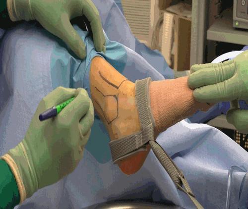 1. 踝关节皮肤表面手术入口的定位和标记,以便能安全的进入踝关节;