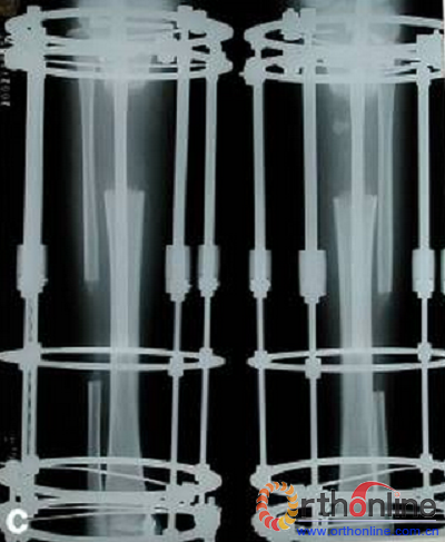 天津医科大学总医院的Guo等对经髓内针骨延长及传统IIizarov骨延长病例进行了比较性研究。传统技术组(A组),13例23个肢体。髓内钉组(B组),26例51个肢体。分析了 (延长幅度、延长指数、外固定 指数、骨愈合指数及并发症等指标。结果显示:胫骨平均延长长度为7.4cm,平均延长幅度为26%。两组间的延长指数或愈合指数无统计差异。而A组戴外固定时间明显比B组长(281.5天,129.0天),即外固定指数大(40d/cm,17.4d/cm)。A组并发症较B组高(1.0/胫骨,0.47/胫骨)。发生固定针断裂两组各有1例,针道感染A组11例 (47.8%),B组8例(15.6%)。无深部感染发生。B组锁钉断裂3例(5.9%)。髓内钉断烈1例(1.9%),系因车祸造成。A组2 例延迟愈合,外固定时间延长。B组1例,经植骨治疗愈合。A 组2膝,(8.7%)及4踝(17.4%)发生屈曲挛缩,2踝合并内翻畸形。经理疗膝及其中2踝功能完全恢复,2踝活动度丧失5°。B 组3膝(5.9%)及4踝(7.8%)发生屈曲挛缩,1踝合并内翻畸形,经理疗均完全恢复。该研究结果表明,经髓内钉骨延长与传统IIizarov技术相比外固定时间明显缩短,而且并发症较低。