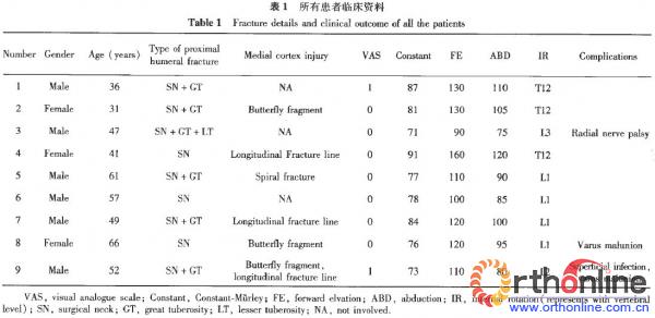 结果 所有患者骨折均愈合,无不愈合、延迟愈合病例。并发症:肱骨头内翻畸形愈合2例,伤口浅表感染1例,术后桡神经麻痹1例,余5例无并发症。末次随访功能情况:平均VAS评分0.22分(0~1分),Constant—Murley评分(79.7 4±6.5)分(71~91分);平均肩关节前屈118°±20°(90°~160°),外展95°±14°(75°~120°),内旋L1。