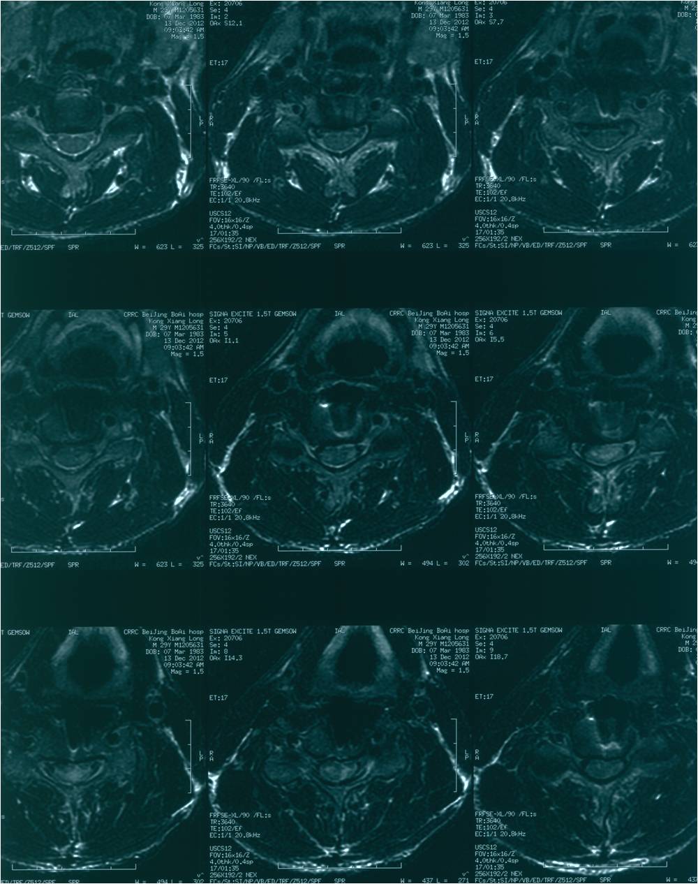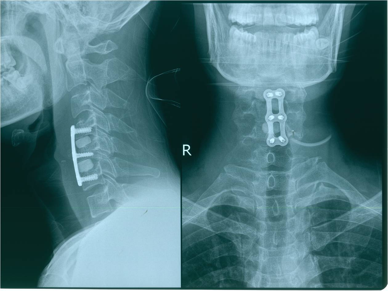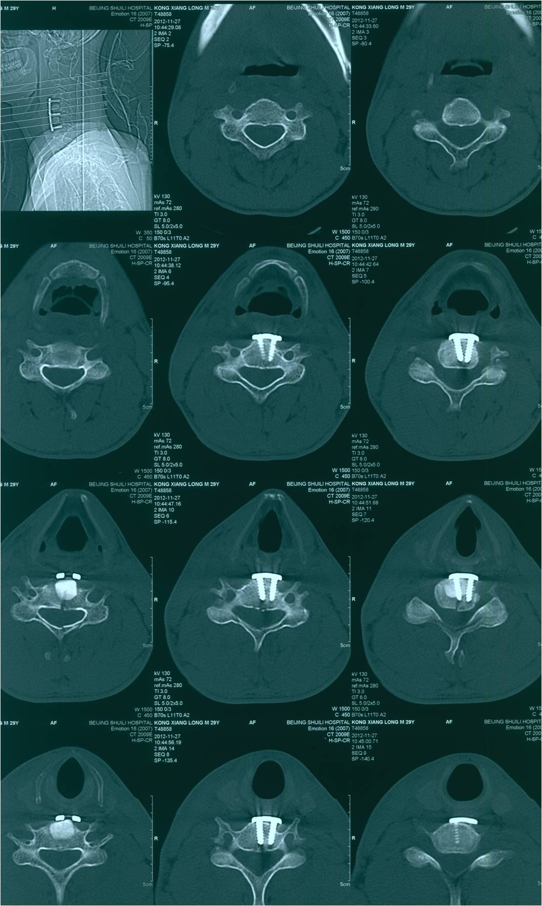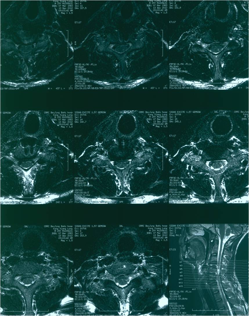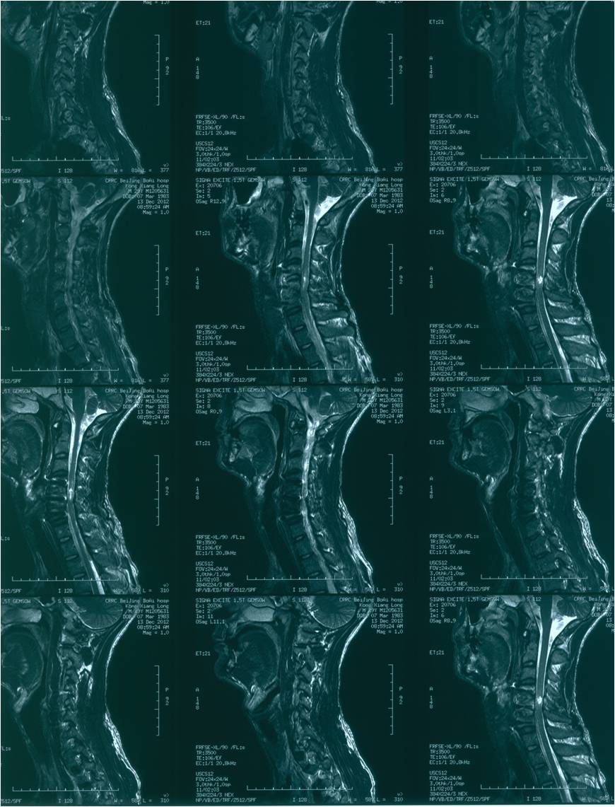 查体:意识清楚,呼吸均匀,查体合作。双侧感觉平面颈4,运动平面颈5. 颈6以下轻触觉保留至肛周,针刺觉消失。颈5以下只有肛门括约肌保留运动功能。下肢肌张力0级。腱反射消失。球海绵体反射可引出。当地医院行X片、CT、MRI检查