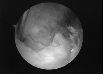 患者,女, 53岁。因“发现左膝肿块2月”入院。体检示左膝腘窝内侧可及4cm*4cm质韧肿块,压痛(-),活动度良好。左膝内侧关节间隙压痛(+),麦氏征(+)。MRI示“左膝腘窝囊肿,左膝内侧半月板损伤”。经完善术前准备后行关节镜治疗术。术中先采用后侧入路,行关节镜下囊肿切除,然后行常规关节镜检查,处理关节腔内半月板损伤,同时经后内侧入路打开腘窝囊肿与关节腔通路。